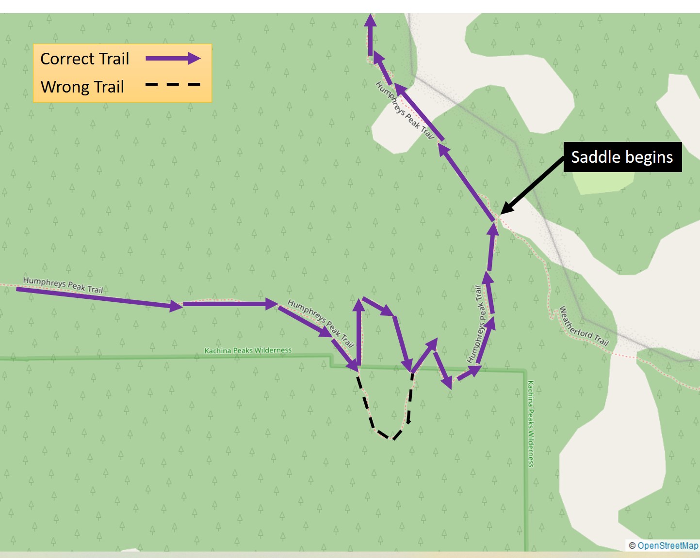 The wooded area marks the boundary of the Kachina Peaks Wilderness area and begins the steady uphill climb to the summit of Humphreys Peak.